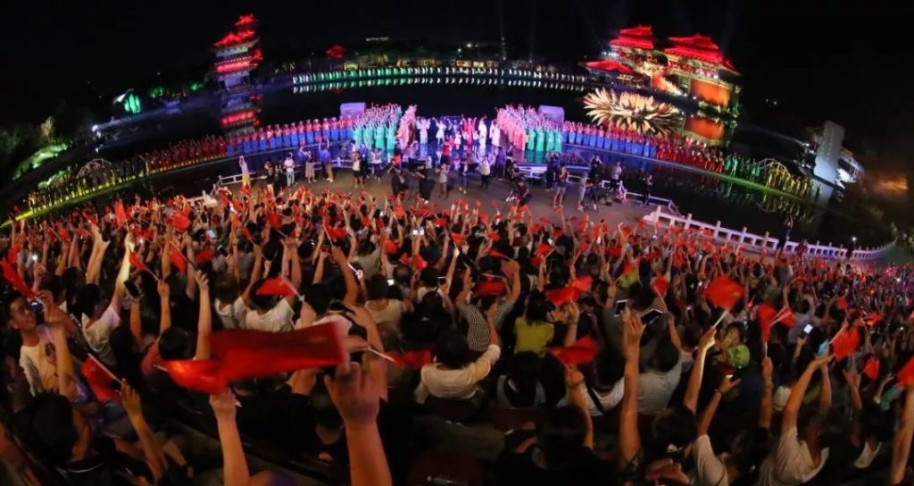 我们忘不了,国庆节的那天晚上,我们策划着,想给你们一个难忘的夜晚,那天晚上,演员和游客用力地挥舞着旗帜,共同唱响《我和我的祖国》,那种要溢出来的爱国热情,响彻了整个清明上河园。