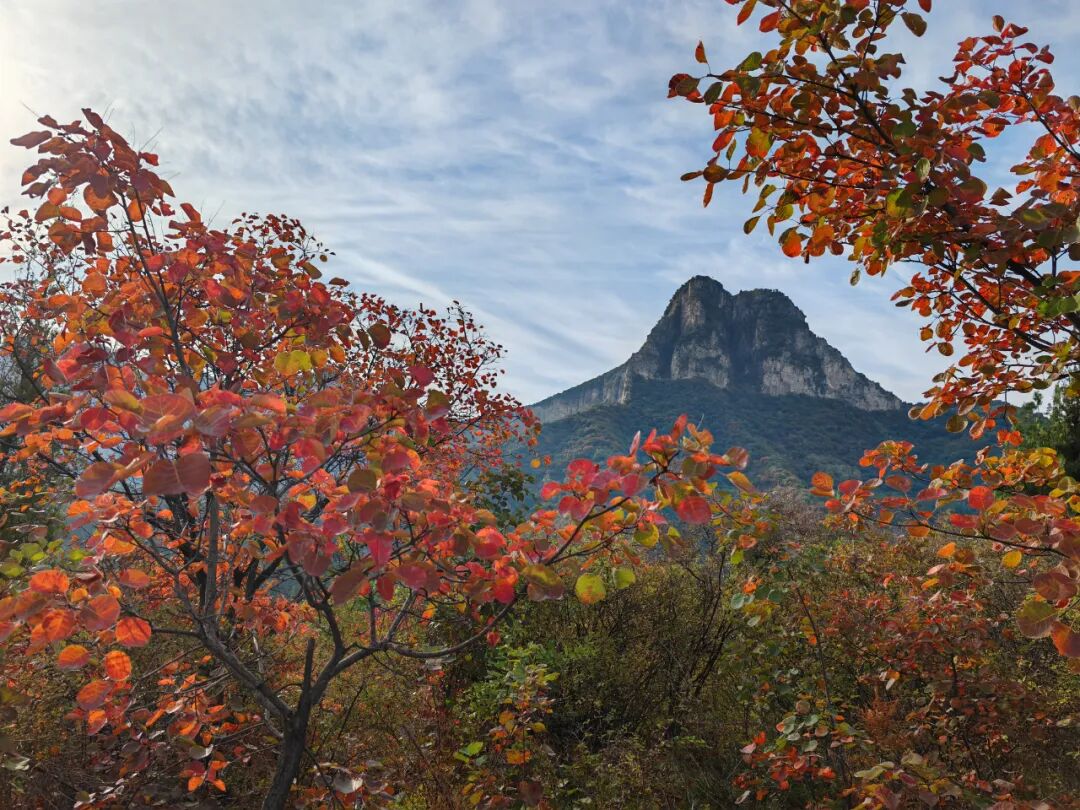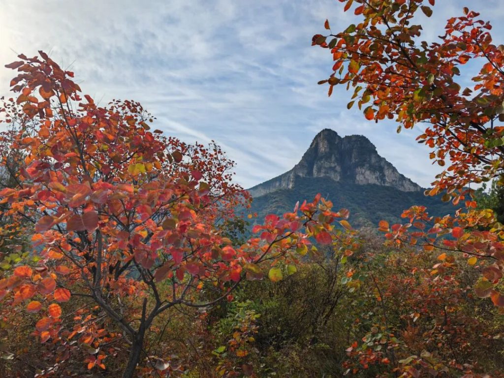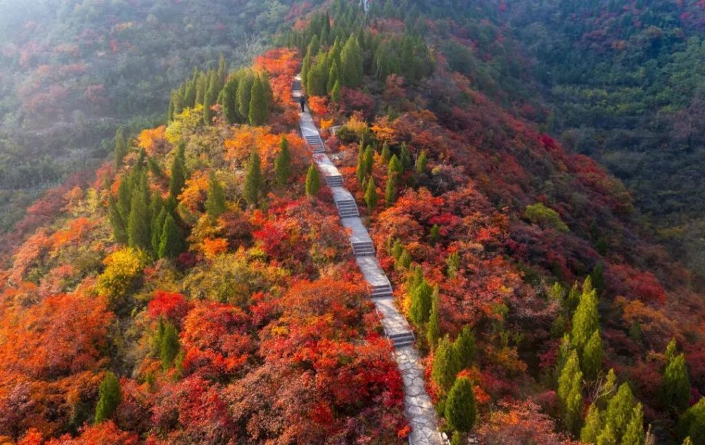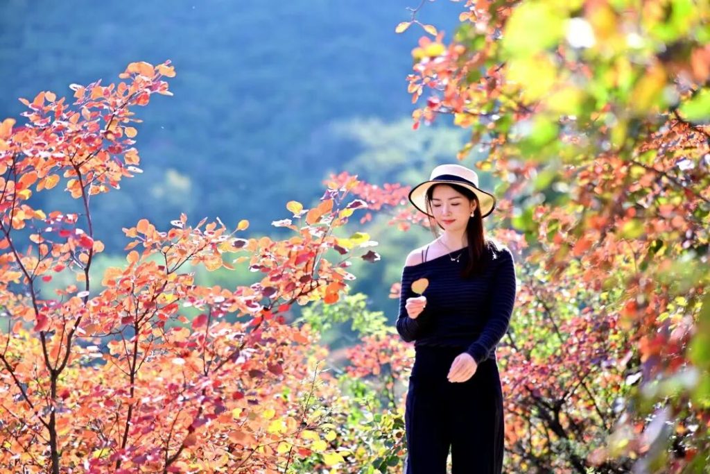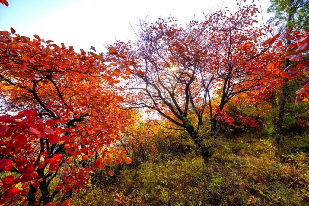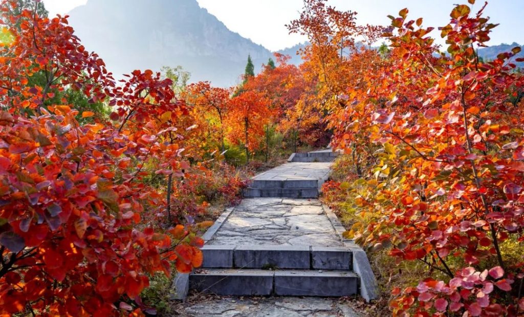 漫山红遍,层林尽染:秋霜过后,黄栌、枫树等树木的叶片次第变红,红、黄、绿交织在一起,宛如一幅巨大的天然油画,气势恢宏,蔚为壮观。