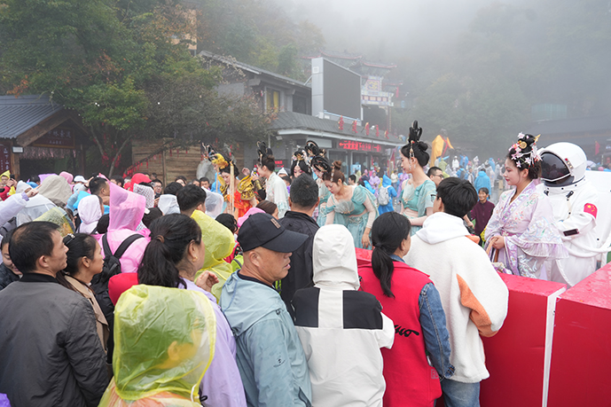 秋日的老君山,层林尽染,云海缭绕,尽管天气微凉,但景区内温暖涌动。许多游客手拿月饼,在山巅金顶前拍照留念,记录下这个别样的中秋佳节。