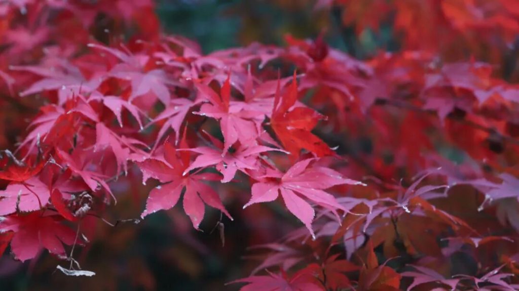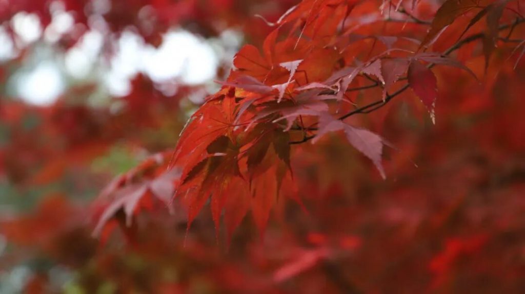 嫩叶鲜红如霞,秋叶渐变橙红、金黄,掌状5裂的叶片似孩童张开的手掌,在阳光下透亮如琥珀。