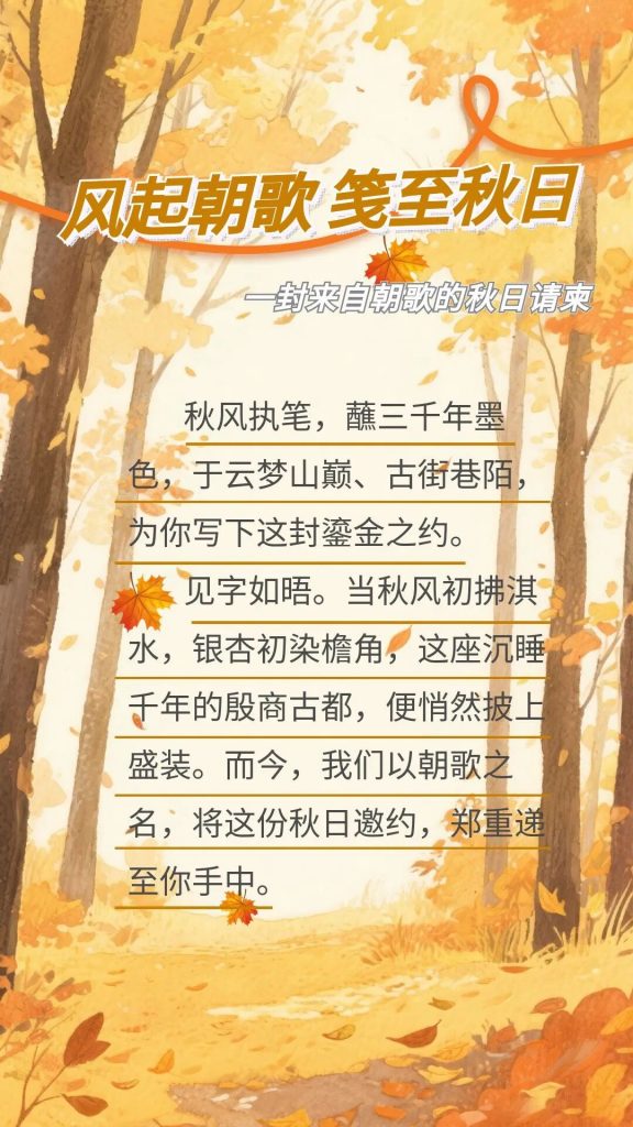 请登临|云梦山·云海与星辉 登临秋色尽染的云梦山。看十里断崖披枫而燃,云海翻涌如诗;鬼谷洞前,犹闻智者低语;南天门上,抬手可触星河。一方宁静天地,已为你备好。 请寻幽|古灵山·封神与传奇 步入古灵山,这座天然的“封神”遗迹博物馆。女娲峰静立,女娲宫清寂,落叶小径引你探寻摩崖石刻。每一处石景,都在秋光中低语着人神共居的往昔。 请徜徉|朝阳山·石刻与天光 攀上秋阳温润的朝阳山。石阶蜿蜒,摩崖石刻在光影间默立;悬空寺古拙,岁月如刻。登顶远眺,田园如画,秋色无垠——那一刻,你便读懂了“朝阳”的全部意义。 请探访|金牛岭·秘境与牧歌 探访五彩环抱的金牛岭。此处无喧,唯有田园牧歌与秋林尽染。漫步其间,仿佛仍能听见,三千年前的金戈铁马,在风中隐隐回响。 请漫步|朝歌古城·烟火与流光 请静坐|遗址公园·落叶与回响 关于秋天 这封请柬,已落上秋日的邮戳。 朝歌的秋,不只是一程风景,更是一场跨越三千年的重逢。 我们,在朝歌秋色最浓处,等你。