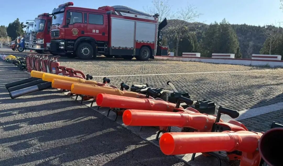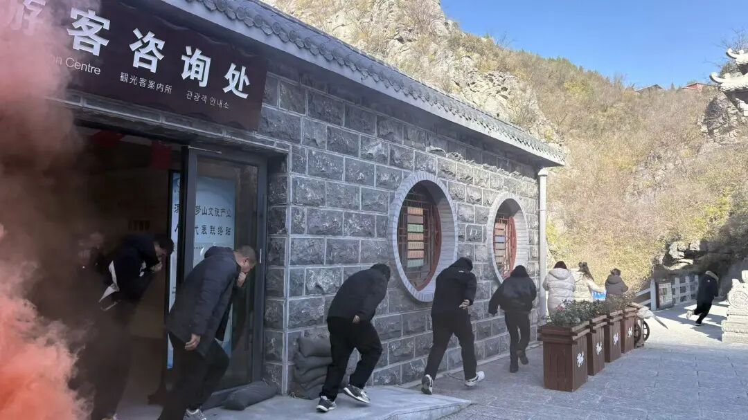 随后开展的实战演练,模拟景区重点区域突发火情。警报响起后,景区消防应急预案迅速启动,疏散引导组、火情扑救组、现场警戒组等应急单元响应及时、协同联动,有序完成火情侦察、人员疏散、明火扑灭等关键任务。从消防车出动、水带连接到水枪出水演示,整个流程衔接紧密、配合高效,充分体现了“生命至上”的救援理念,展现了景区应急队伍扎实的专业素养与协同作战能力。