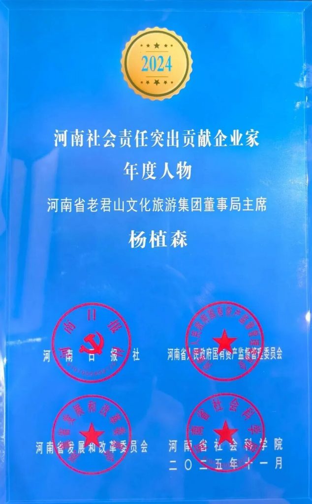 11月18日,2024“河南社会责任企业”及“河南社会责任突出贡献企业家”颁奖典礼在郑州举行,河南省老君山文化旅游集团董事局主席杨植森荣获“2024河南社会责任突出贡献企业家年度人物奖”荣誉称号。