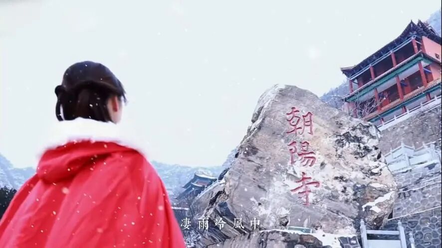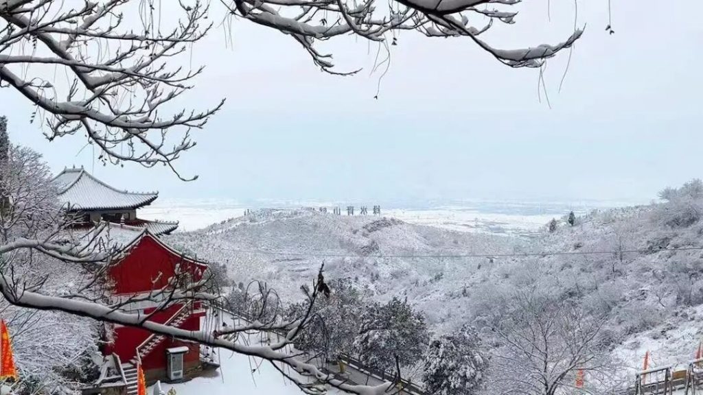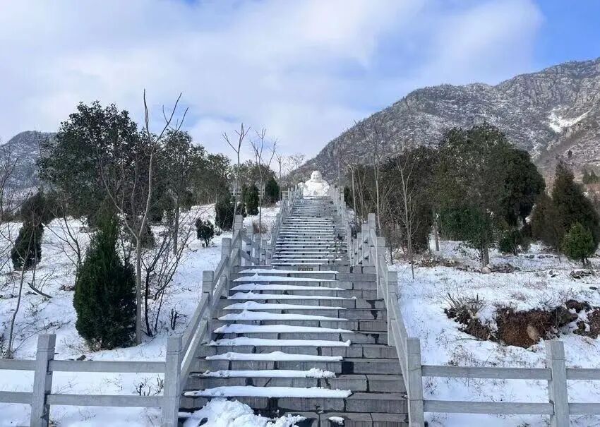初雪如宣纸般铺满朝阳山的石阶