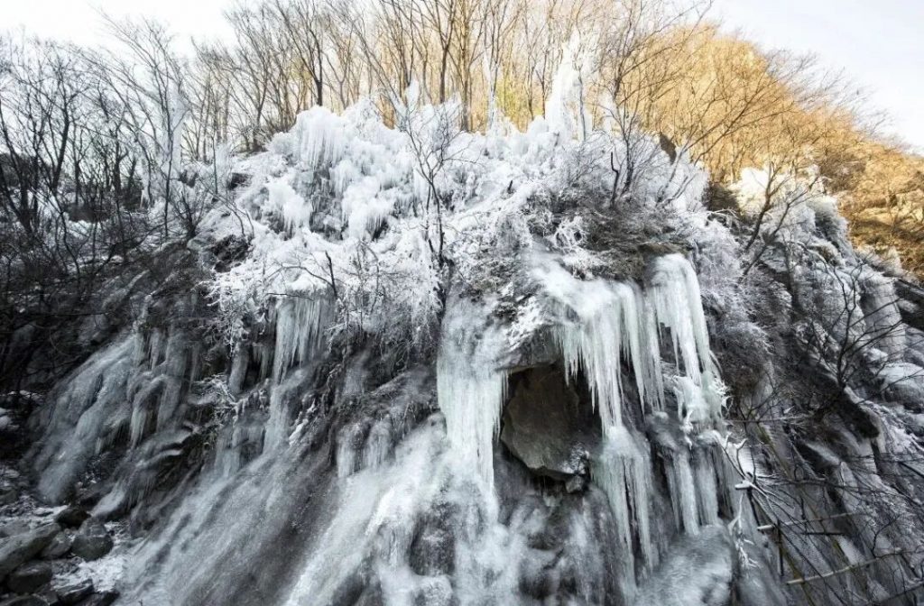 凑近主峰崖壁,还能撞见透亮的冰挂:从岩石缝里垂下来的冰柱,像水晶做的帘幕,阳光一照折射出淡蓝的光 —— 伸手碰一下,凉得指尖发麻,却忍不住想多摸两下这冬天的「硬糖」~