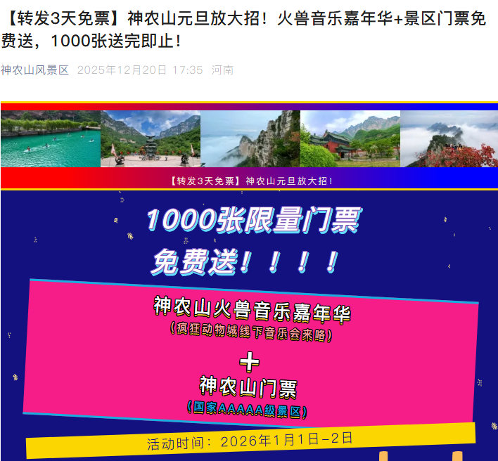 完成转发后,2026年1月1日-2日,凭3天完整转发记录,到神农山游客服务中心售票窗口兑换免费门票。