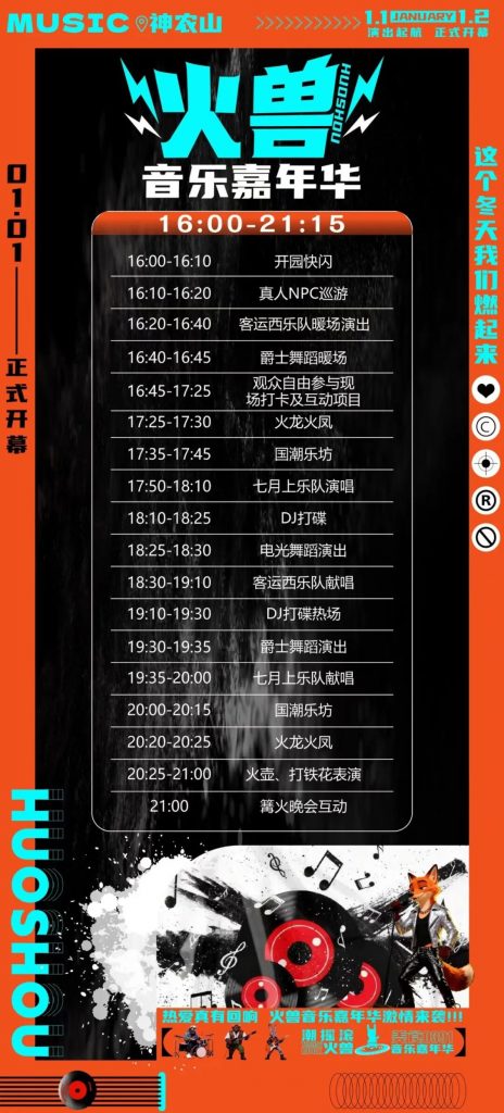 节目单 转发免票 ⏰ 转发免票最后2天!错过真的亏大了 还没领免费门票(含景区门票 + 嘉年华入场券)的宝子,立刻按以下步骤操作: 截至12月31日,连续3天转发下方指定文章到朋友圈; 2.配文必须带:“元旦谁和我一起冲神农山!免费逛AAAAA景区 + 音乐嘉年华!”(不可分组 / 屏蔽); 3.1月1日 – 2日,凭3天转发记录到游客服务中心兑票(1000张先到先得,一人限兑1张)。 游玩攻略 ⚠️ 景区16点后停止入园,记得白天先游山。 路线:游客服务中心→云阳寨→神农文化广场→神农山始祖文化园→猕猴苑→神农山客运索道(或登山步道)→一天门→中天门→南天门→紫金顶→龙首台→龙脊长城→原路返回(或后山徒步下山)→16点前返程游客服务中心,无缝衔接嘉年华 这个元旦, 在仙境里追NPC、听乐队、 看非遗打铁花, 快乐直接拉满! 现在转发倒计时已进入最后阶段, 赶紧喊上搭子冲!