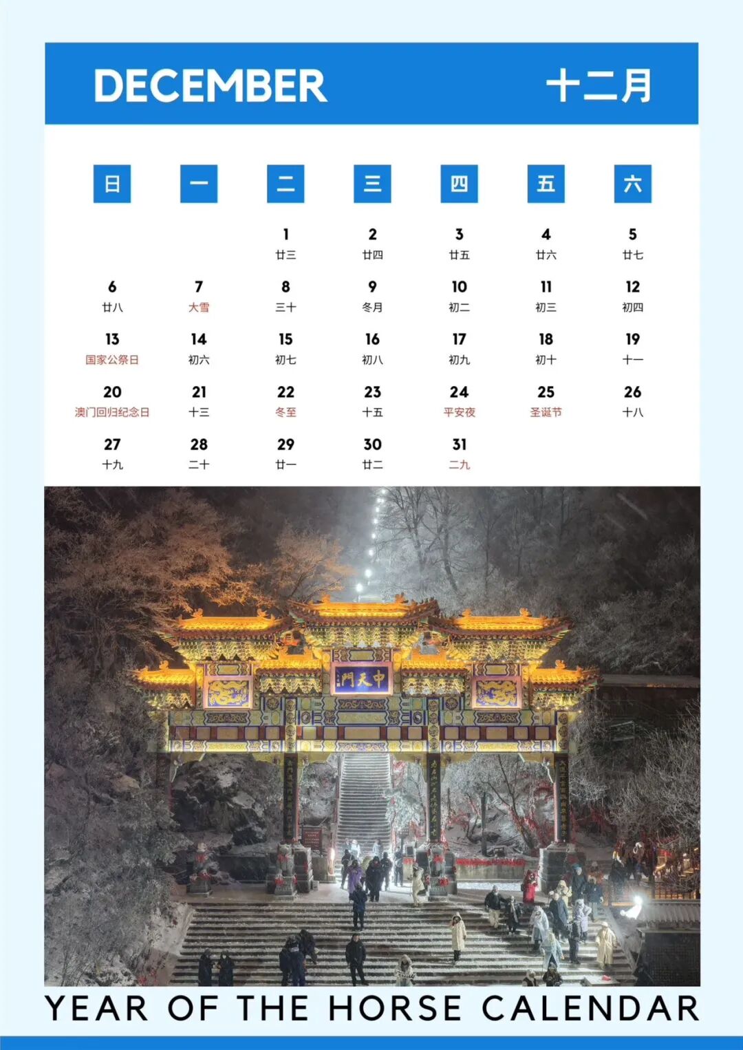 中天门的古建飞檐,在深冬雪夜中静默矗立,红灯映雪,恍如通往天宫仙阁的入口。岁末在此,静候新生。