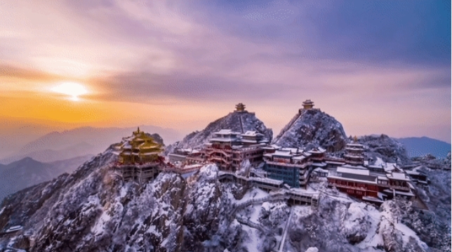冬日的日出日落是老君山最值得守候的时刻。当阳光穿透云层,洒在白雪覆盖的山巅,金顶顿时光芒万丈,整座山仿佛被点燃,那份宁静与壮美,足以治愈一整年的疲惫。