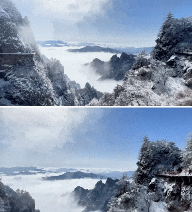 雪海:云海之上的冰雪仙境 当寒流遇上水汽,老君山上便会出现罕见的“云海”奇观。这不是普通的雪景,而是云海在低温下凝结成的白色海洋,连绵的山峰如海中的岛屿,仿佛置身仙境。