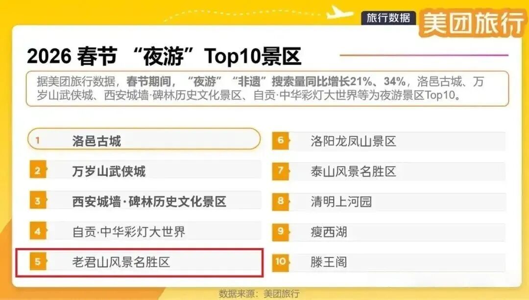 2月23日,美团正式发布《2026春节消费洞察报告》,在备受瞩目的“春节期间夜游景区Top10”榜单中,老君山景区凭借独特的夜游魅力强势上榜,位列全国第五!