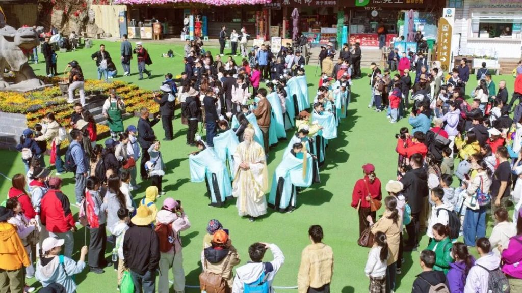 春日晴暖,气温渐升,旅途燥热令人疲惫。景区贴心考量,在停车场、索道站等游客密集区域设置免费送水点,工作人员为过往游客递上清凉矿泉水,既驱散了旅途的烦闷,也让每一位游客都感受到了老君山的热忱与诚意。除了贴心关怀,景区还为游客准备了趣味惊喜。中天门广场上,机器狗“君仔”与智能机器人活力登场,与游客亲密互动,成为假期里的“网红打卡点”,为大家的旅途增添了满满的欢乐。下山高峰期,为缓解游客排队时的焦躁情绪,景区表演组主动发力,自导自演各类趣味节目,在排队区域现场演绎,缓解了游客等待的枯燥,让原本漫长的排队时光变得轻松愉悦。不止有临时的暖心演绎,在中天门广场还准备了丰富多样的特色演出,贯穿整个清明假期。游客在游览仙山风光、感受道家文化的同时,还能沉浸式体验旅途乐趣,留下一段难忘的清明仙山记忆。清明假期已圆满结束,每一项暖心举措,都是老君山“游客至上、服务至诚”理念的生动践行;每一次真诚付出,都只为守护游客的美好旅途。