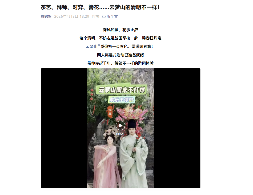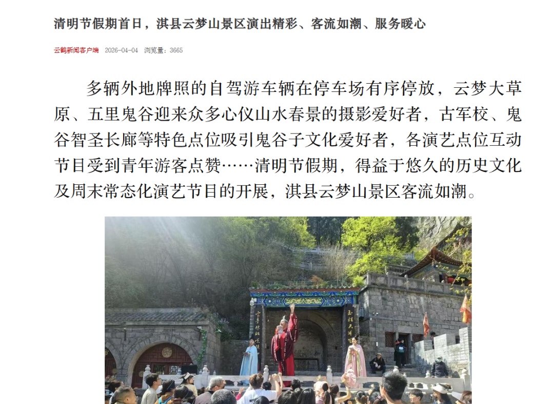 人气高涨:客流有序,热度拉满 活动亮点:全程畅玩,精彩不停 服务保障:全员在岗,暖心护航 媒体聚焦:实力“出圈”,全网热度拉满 清明收官不是终点,而是更美相遇的序章 云梦山,永远为你留下一份温情、一场好梦 我们,下次见!