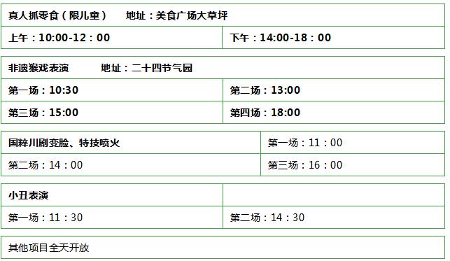 疯狂动物节+非遗猴戏表演+国粹川剧变脸+特技喷火表演+小丑表演+真人抓零食+赶海乐园+木香花长廊+玫瑰园+萌宠王国+鸟语林+无动力游乐场+北山迷宫+二十四节气园