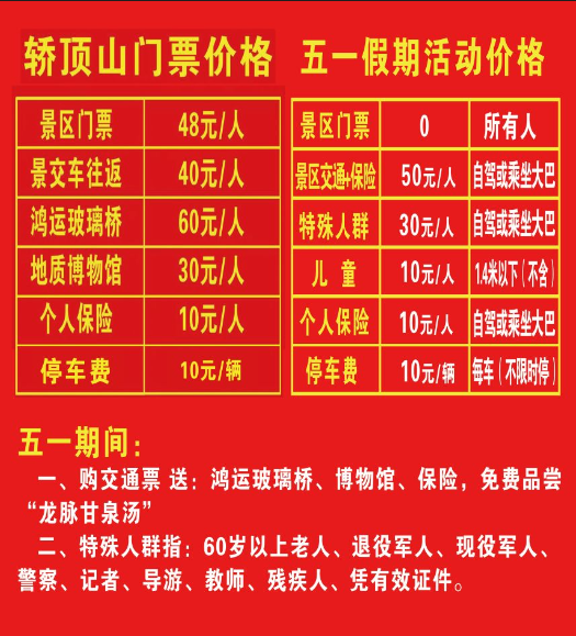 所有人免景区门票,抖音团购预售:第一波自驾上山单人交通票仅19.9元、第二波29.9元、第三波39.9元,在轿顶山主峰玉皇大帝前广场,为大家提供了免费的“龙脉甘泉汤”,并且还送:鸿运玻璃桥、地质博物馆、个人保险,预售票数量有限,售完为止,请在抖音提前囤票。